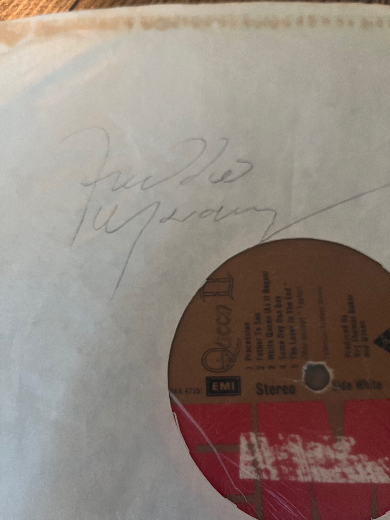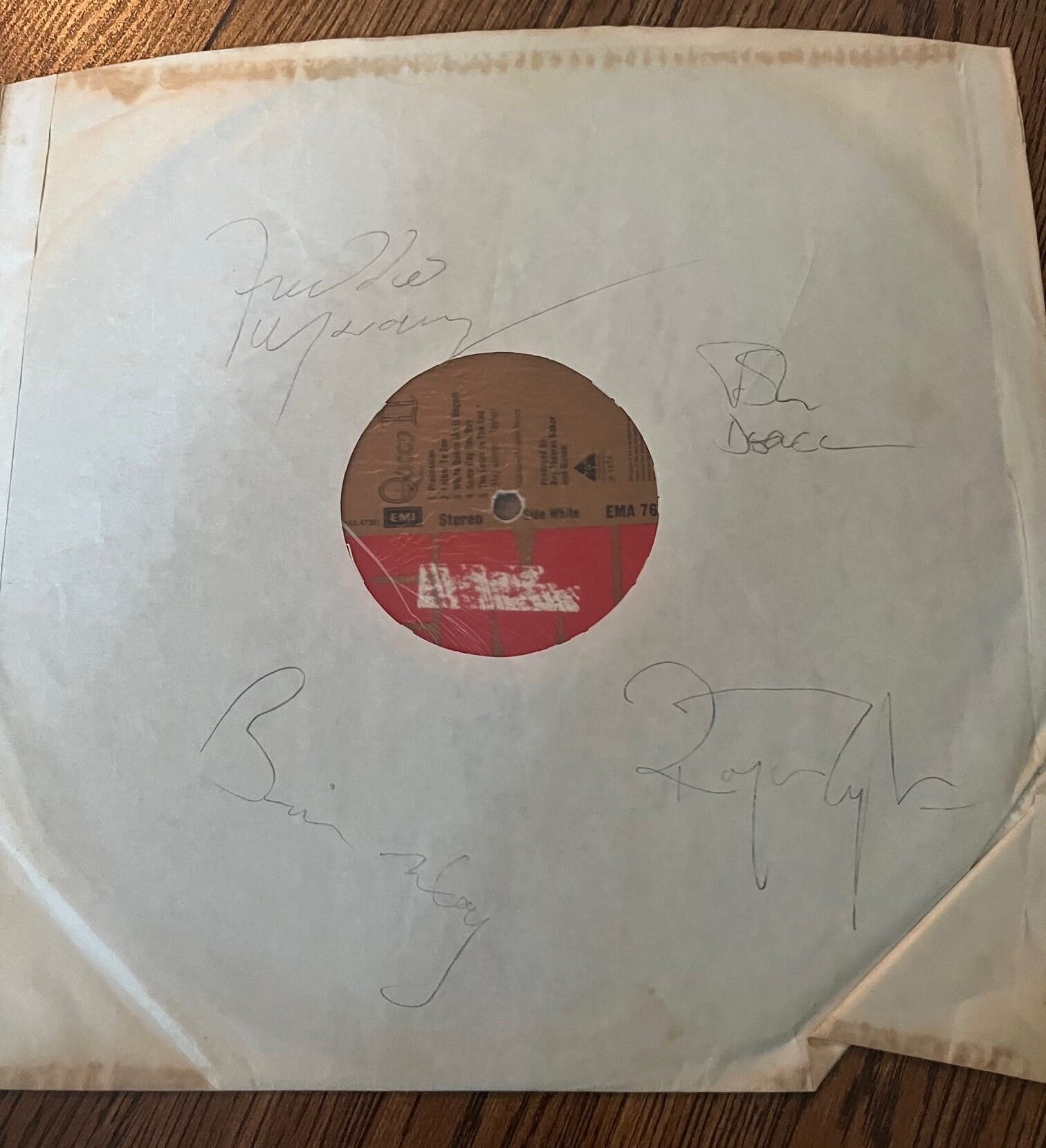 A vinyl LP (Queen II) with a mid-80’s set of Queen autographs signed on the album dust jacket. A full set of autographs in pencil consisting of Freddie Mercury, John Deacon, Brian May and Roger Taylor.