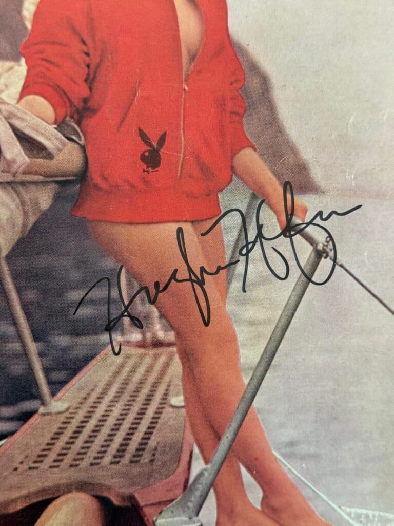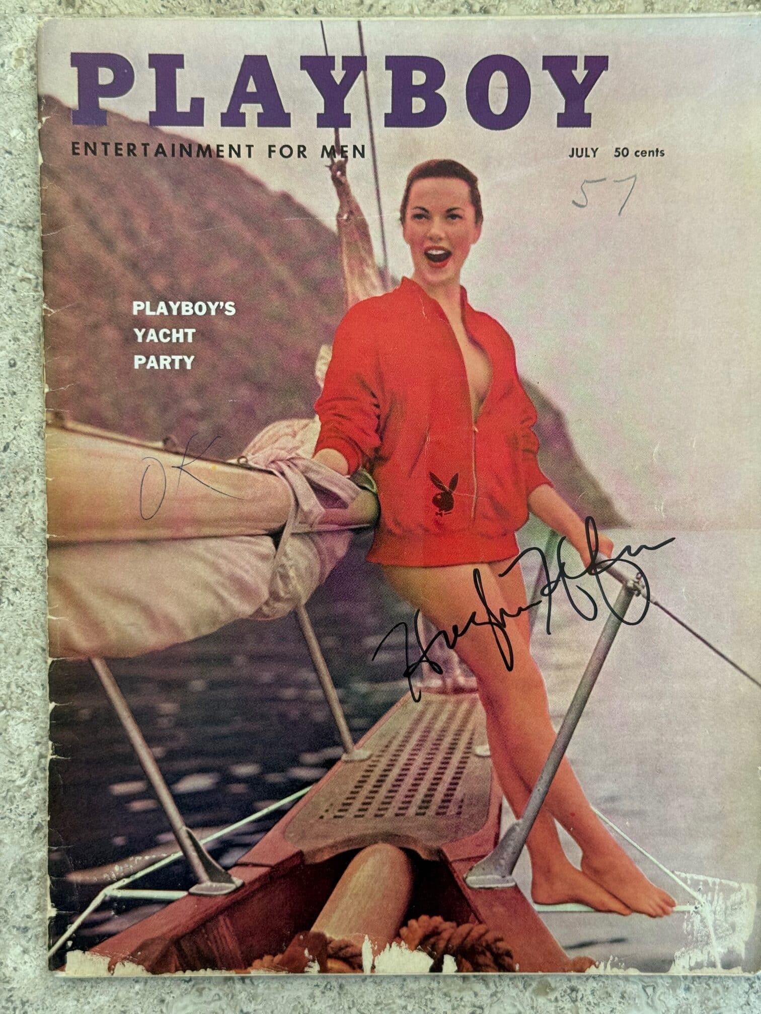 Hugh Hefner autograph on a Playboy magazine cover, dated July 1957. Good Hefner autograph, in black sharpie pen. Consistent with other genuine examples. Slightly rushed.