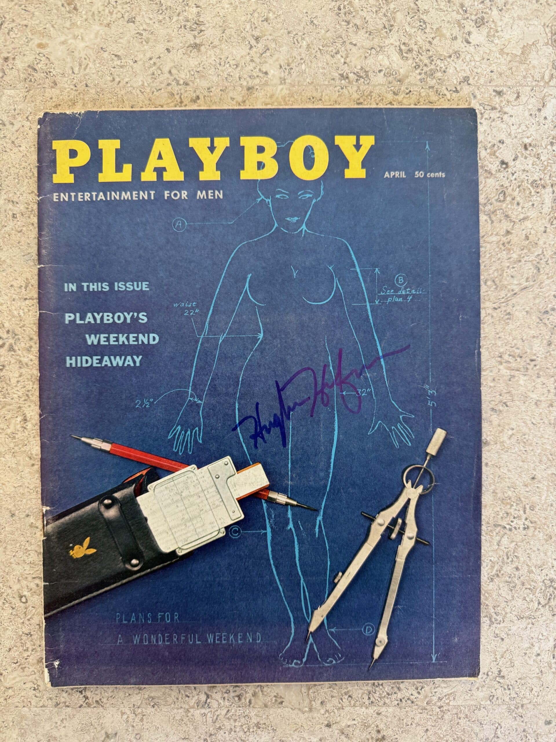 Hugh Hefner autograph on a Playboy magazine cover, dated April 1959. Good Hefner autograph, in blue sharpie pen. Consistent with other genuine examples.