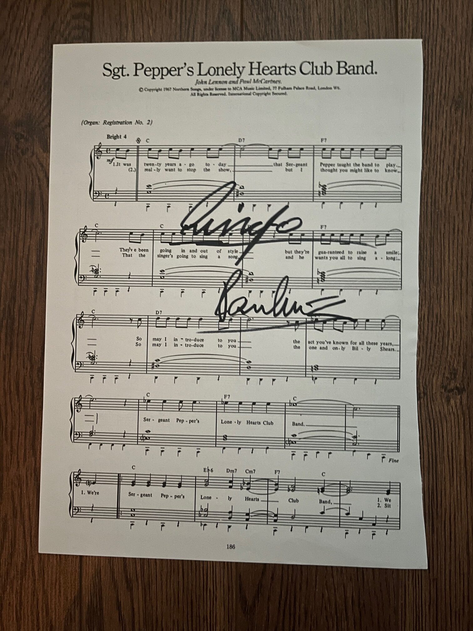 A piece of sheet music (Sgt. Pepper’s Lonely Hearts Club Band) signed by Paul McCartney and Ringo Starr. Good short form examples from both.
