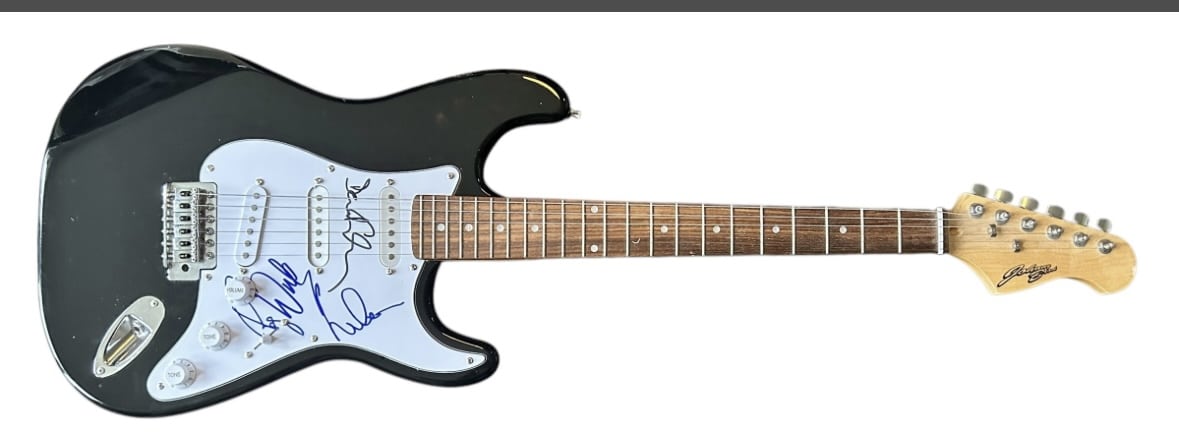 An electric guitar, autographed by Roger Waters, David Gilmour and Nick Mason of Pink Floyd. Good examples of modern contemporary Floyd autographs. Waters autograph is great size, flow and shape to the signing. Mason again an excellent modern example. Gilmour is as would be expected of a modern examaple.