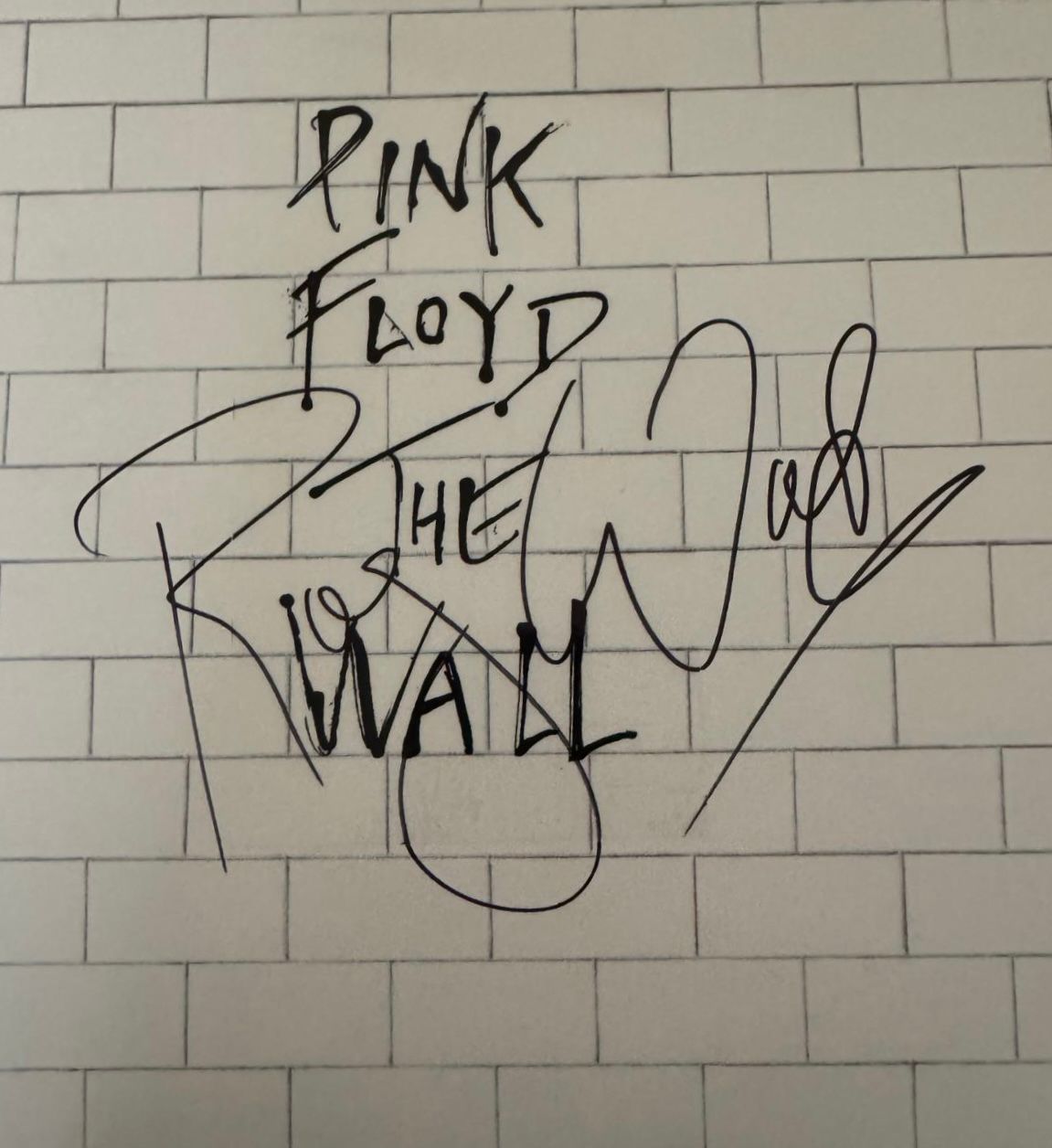 A The Wall vinyl LP autographed on the front cover in black sharpie pen by Roger Waters of Pink Floyd. A nice clear absolutely typical autograph from Roger Waters very consistent with modern examples from 2010’s to 2020s.