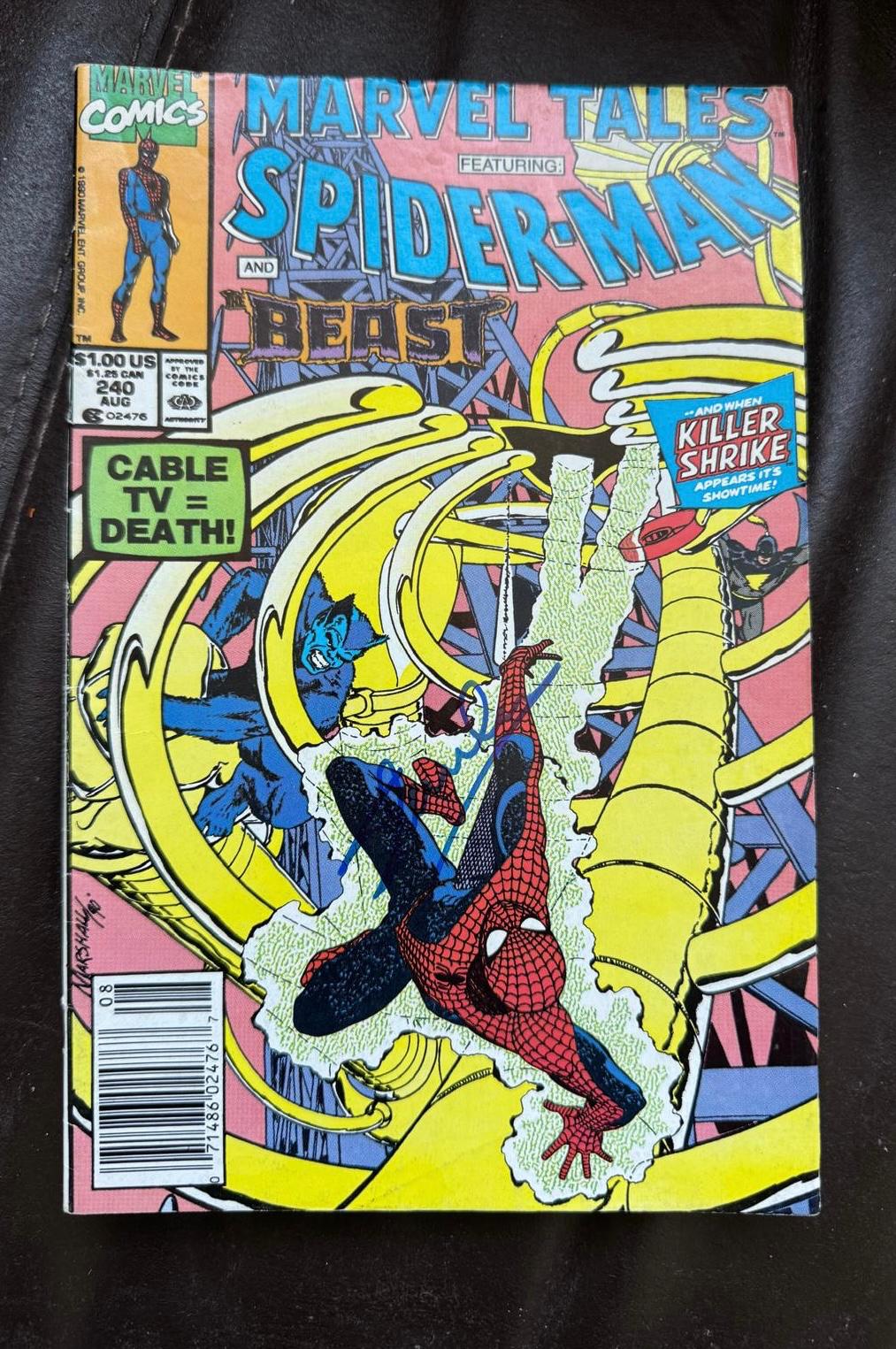 A Spider-Man comic, autographed on the front cover in blue sharpie pen by Stan Lee. Good, fluid full name signing. Typical of what would be expected from a classic Lee autograph.