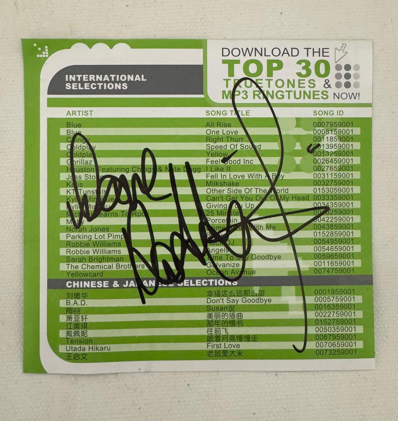 A promotional flyer autographed by Robbie Williams. Autograph in bold, black sharpie pen. Clear and concise signing.
