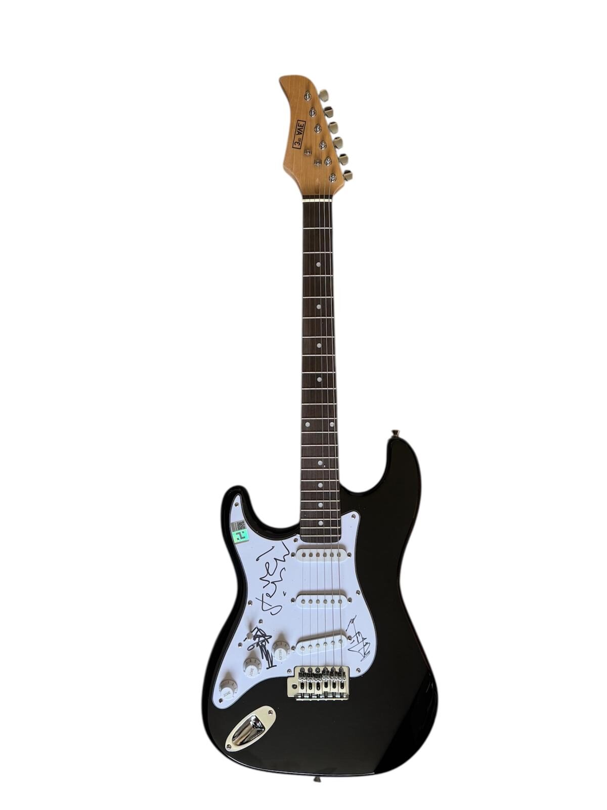 An electric guitar, autographed by Mick Jagger, Keith Richards, and Ronnie Wood of The Rolling Stones. Item is signed in black sharpie pen on the scratchplate. Excellent set of Stones autographs. Jagger a fast signing. Full name and complete. Slight miss at end of autograph due to nature of the shape of item being signed. Wood autograph is a very good full name example. Bold signing. Excellent shape, flow and form. Richards is a very nice full name example. Heavy, quick and bold signing as would be expected. A nice set of genuine Stones autographs.