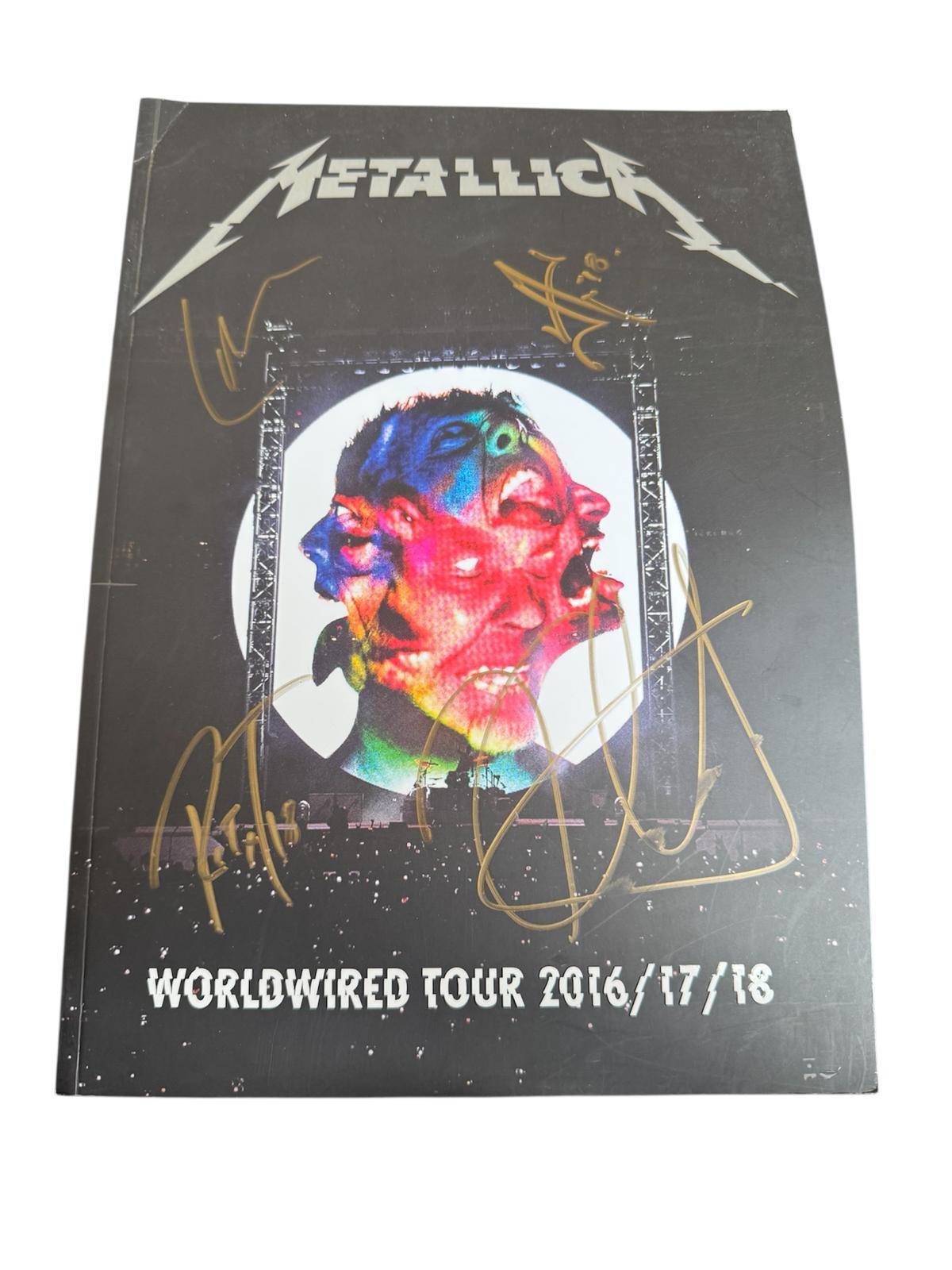 A tour programme from Metallicas 2016-2018 Worldwired Tour autographed in gold sharpie pen by James Hetfield, Kirk Hammett, Lars Ulrich and Robert Trujillo of Metallica. A really nice, clean and neat set of Metallica autographs. Style of signings is that of the tour era. Hetfield is his older style autograph. Typical example. Hammett is excellent. Size, flow and style all authentic. Ulrich is typical of his fast street signing style. Trujillo absolutely textbook. Excellent full name example.