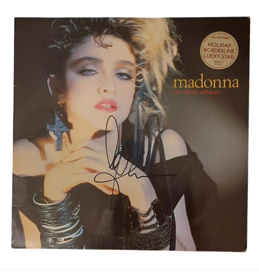 A vinyl LP (The First Album) autographed by Madonna. Nice full, free flowing genuine example of an early 2000’s Madonna autograph. Excellent flow and size. Matches with known genuine contemporary examples.
