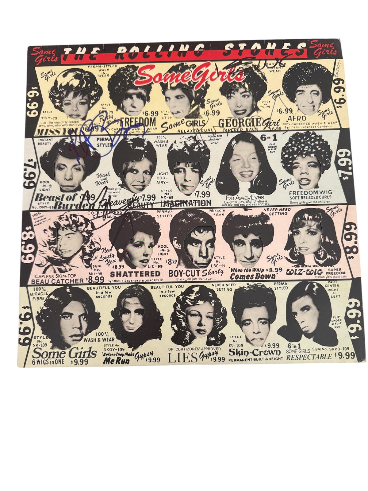 A vinyl LP (Some Girls) autographed by Mick Jagger, Keith Richards, Ronnie Wood and Charlie Watts of The Rolling Stones. Signed on the front cover by Mick Jagger, Keith Richards, Charlie Watts and Ronnie Wood. Jagger is a rushed street autograph. Not the greatest example but still passes as genuine. Richards is again a street autograph, but a full signing. Rushed but still a fine example. Watts is a good example. Missing date makes us think that it is also a street signing. Wood is a nice full name signing. Autographed in biro, unlike the others which are black/blue sharpie. Autographs likely to be from 2010’s