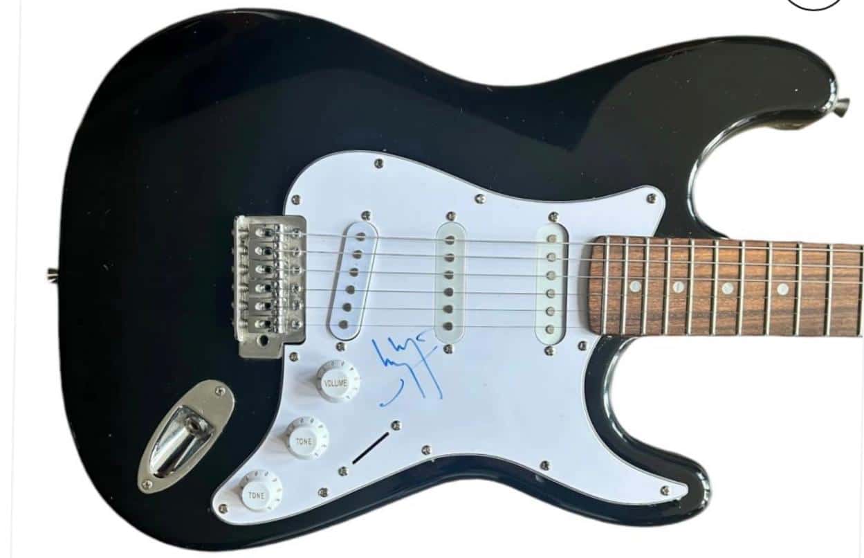 An electric guitar, autographed on the scratchplate in blue sharpie pen by Jimmy Page of Led Zeppelin. Nice signing from the mid to late 2000’s. All the characteristics of a Page autograph from that era are correct