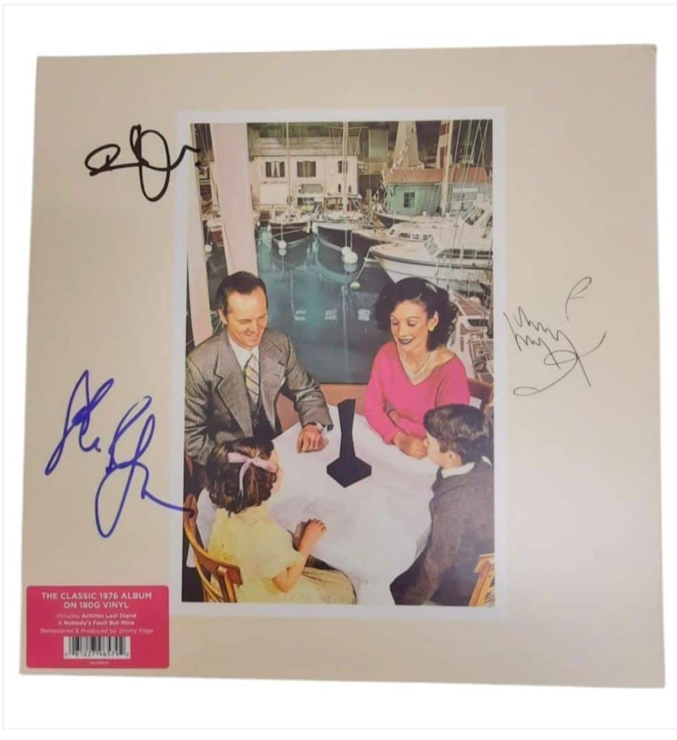 A vinyl LP (Presence) autographed by Robert Plant, Jimmy Page and John Paul Jones of Led Zeppelin. Good set of Zeppelin autographs. Plant, signed in black sharpie is a good, very recognisible example. Page, signed in black biro, is an extremely nice, classic autograph. Scores highly. Jones is a rushed street signing from past 5 years. Shape, size and flow correct but a little untidy.
