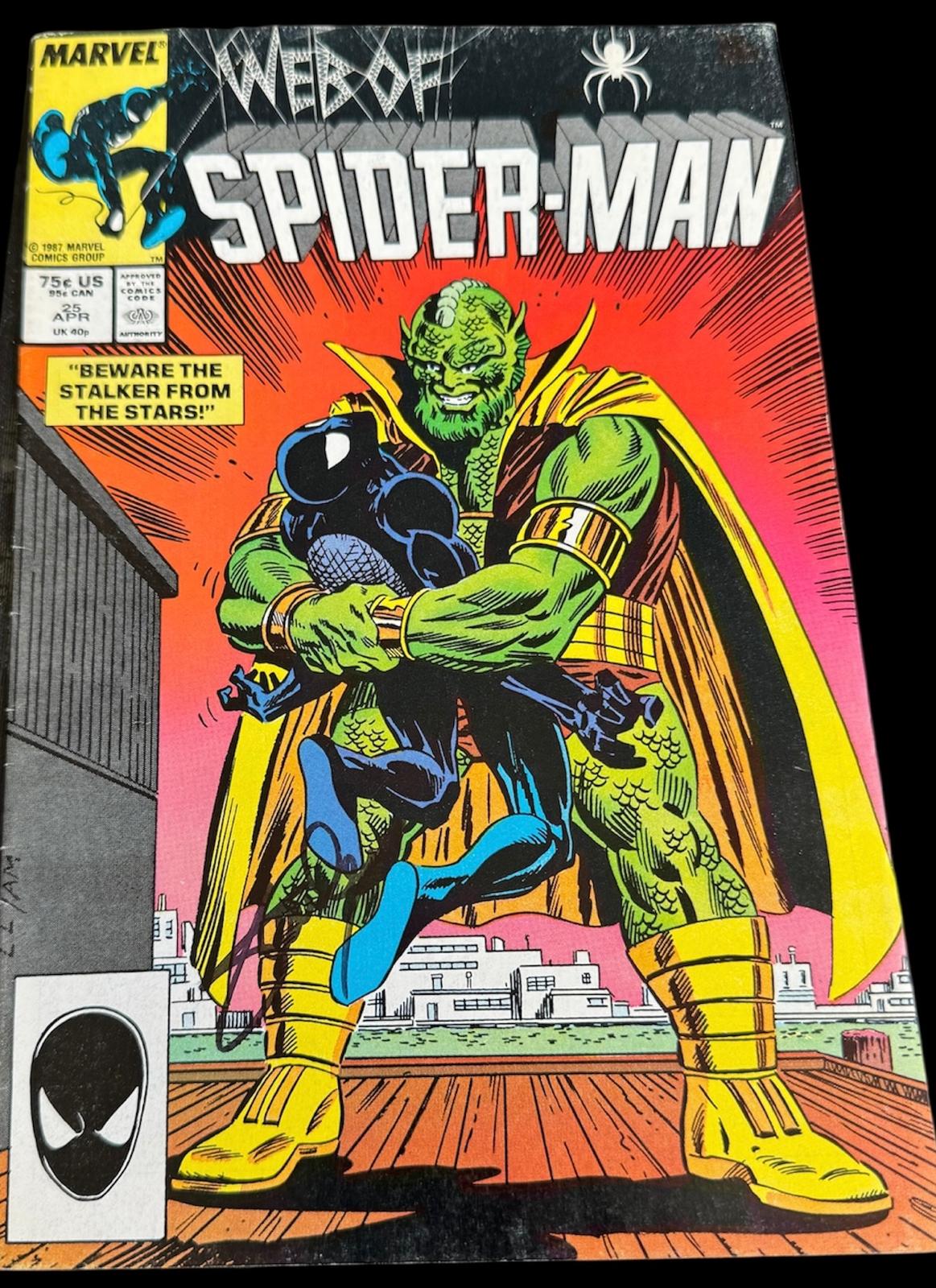 A comic book (Web of Spider-Man) autographed by Stan Lee. A late autograph from Stan Lee. Shakier than his earlier autographs and not as precise, but still matches with autographs from that era.