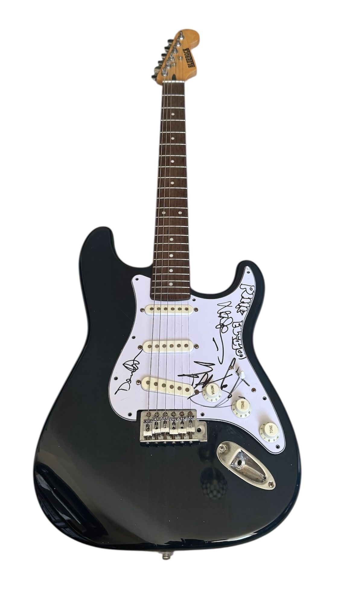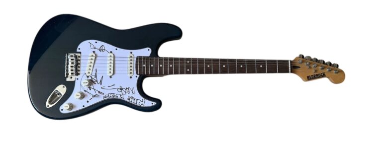 An electric guitar, autographed on the scratchplate by Roger Waters, Nick Mason and David Gilmour of Pink Floyd. Nice set of three Floyd autographs. Waters is a typical early 2000’s signing. Flow, pressure and shape of the autograph is good. Mason has incuded the bubble writing “Pink Floyd” inscription above his signing. Autograph itself is an excellent full name example. Gilmour is a slightly abbreviated signing but still a good genuine autograph.