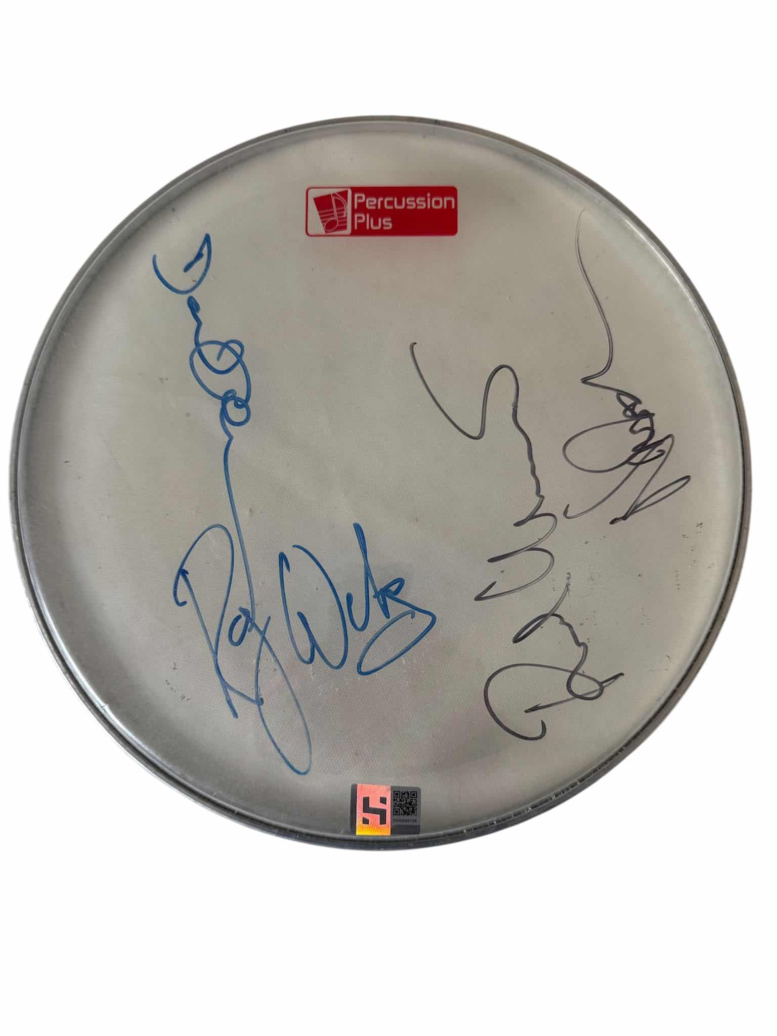 A drumskin, autographed by Roger Waters, Nick Mason, David Gilmour and Richard Wright of Pink Floyd. Nice set of three Floyd autographs. Waters is a typical early 2000’s signing. Flow, pressure and shape of the autograph is good. Mason autograph is an excellent full name example. Gilmour is an excellent textbook signing. Wright autograph, also a fine late example.