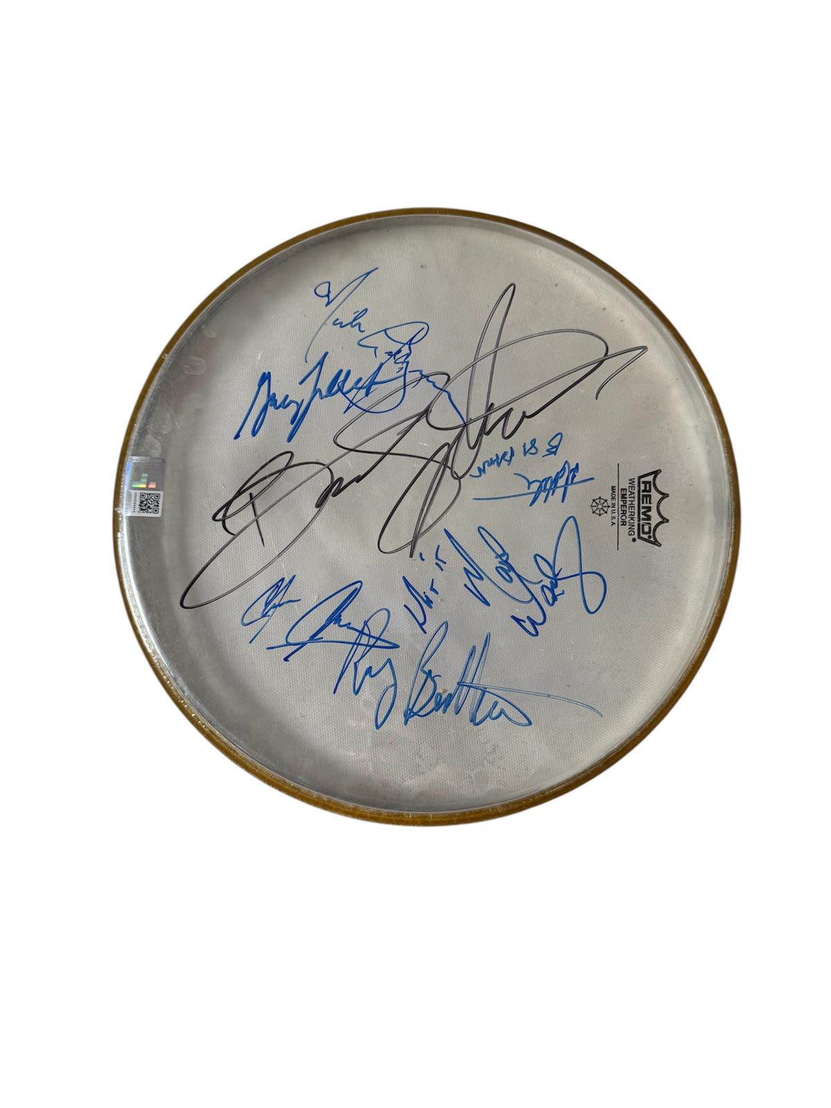 A drumskin, autographed by Bruce Springsteen, Garry Tallent, Roy Bittan, Max Weinberg, Nils Lofgren and Clarence Clemons of The E Street Band. A great set of E Street band autographs from the early 2000’s Autographs all consistant with comparables from contemporary genuine examples.