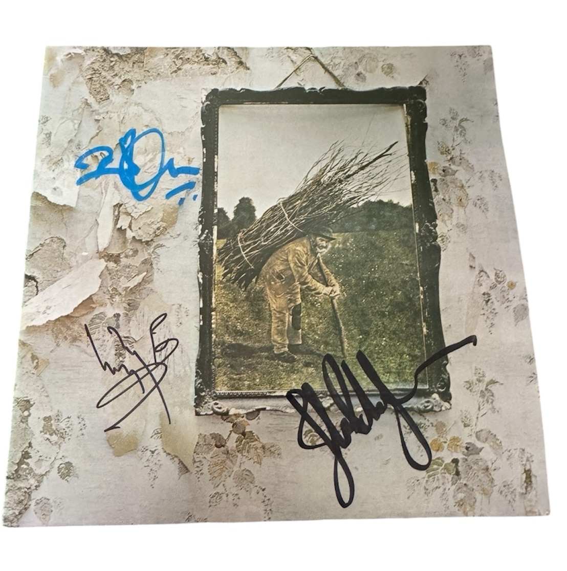 A vinyl LP (Led Zeppelin IV) autographed by Robert Plant, Jimmy Page and John Paul Jones of Led Zeppelin. Nice set of Led Zeppelin autographs. Plant and Jones typical modern examples. Page probably signed recently also.