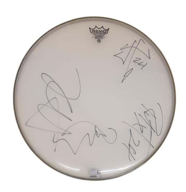 A drumskin, autographed by James Hetfield, Lars Ulrich, Kirk Hammett and Robert Trujillo of Metallica. Item is signed in black sharpie pen. Excellent full set. Increasingly rare due to mainly Hetfields reluctance to sign.
