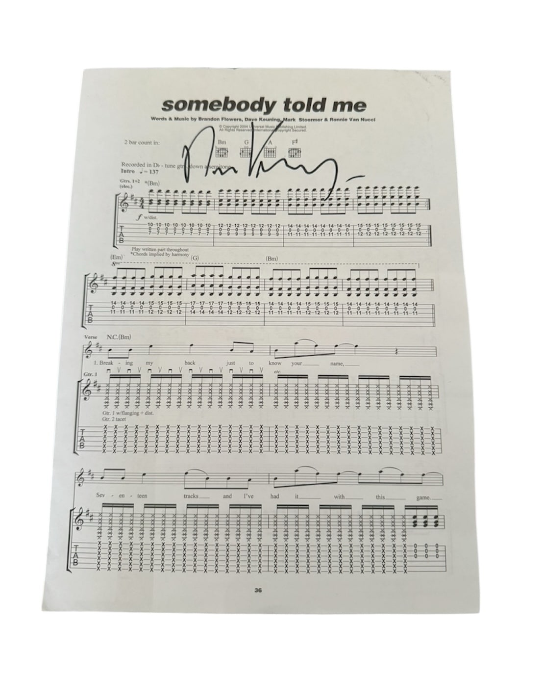 Sheet music (Somebody Told Me) signed by Dave Keuning of The Killers. Good example of a genuine Keuning autograph.
