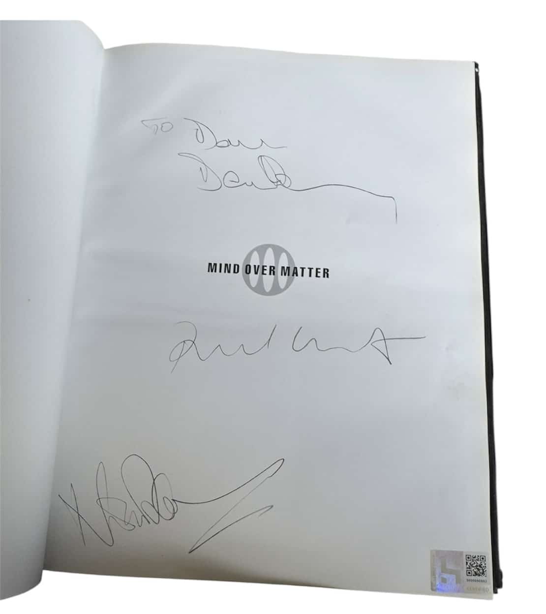 A book (Mind Over Matter) autographed by David Gilmour, Richard Wright and Nick Mason of Pink Floyd. Excellent set of Floyd signings.
