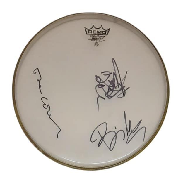 A drumskin, signed in black sharpie pen by all three members of Green Day. Good genuine set.