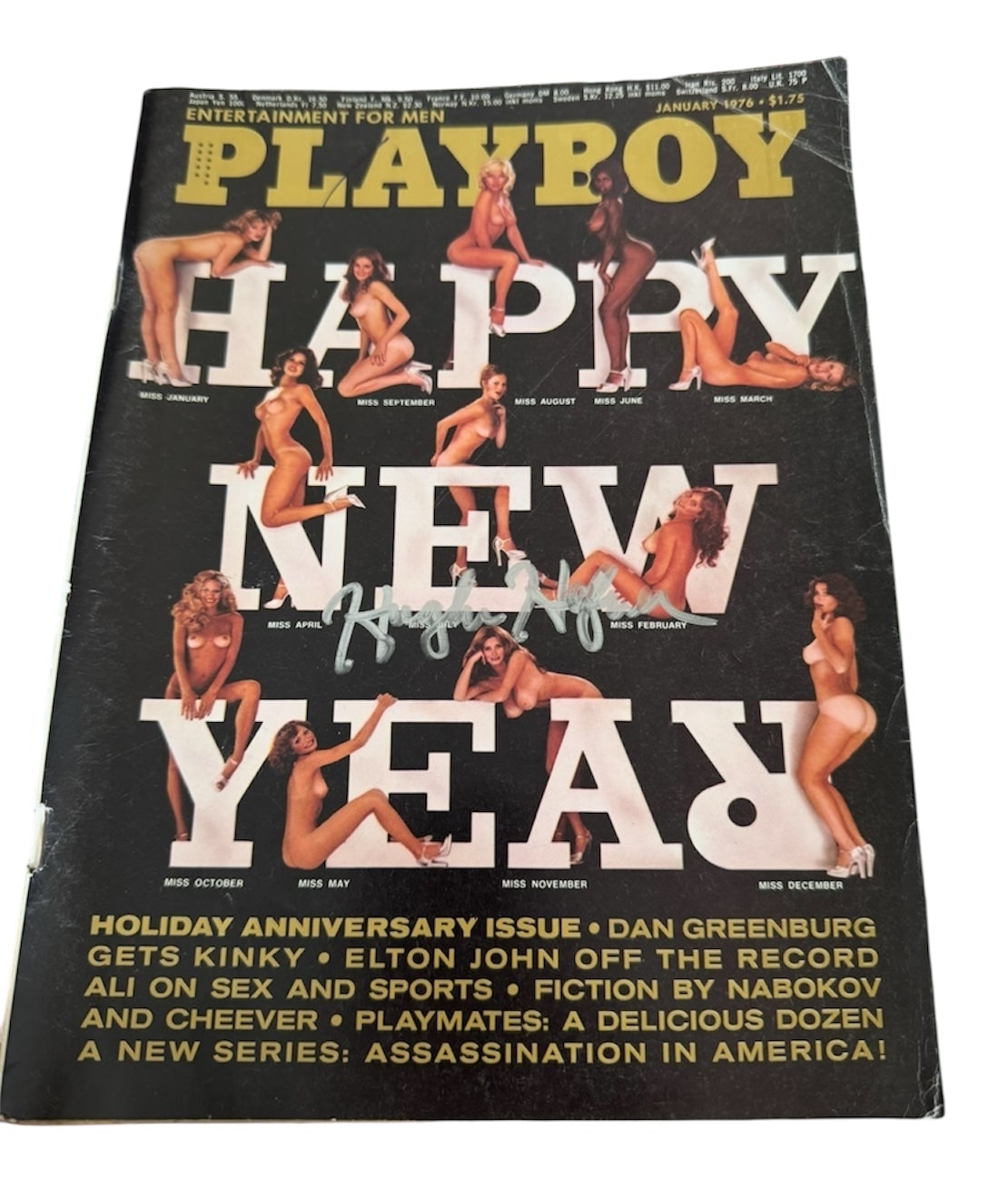 A Playboy magazine (January 1976) autographed in silver sharpie pen on the front cover by Hugh Hefner. Good clean Hefner signing. Style, shape and pressure as all to be expected.