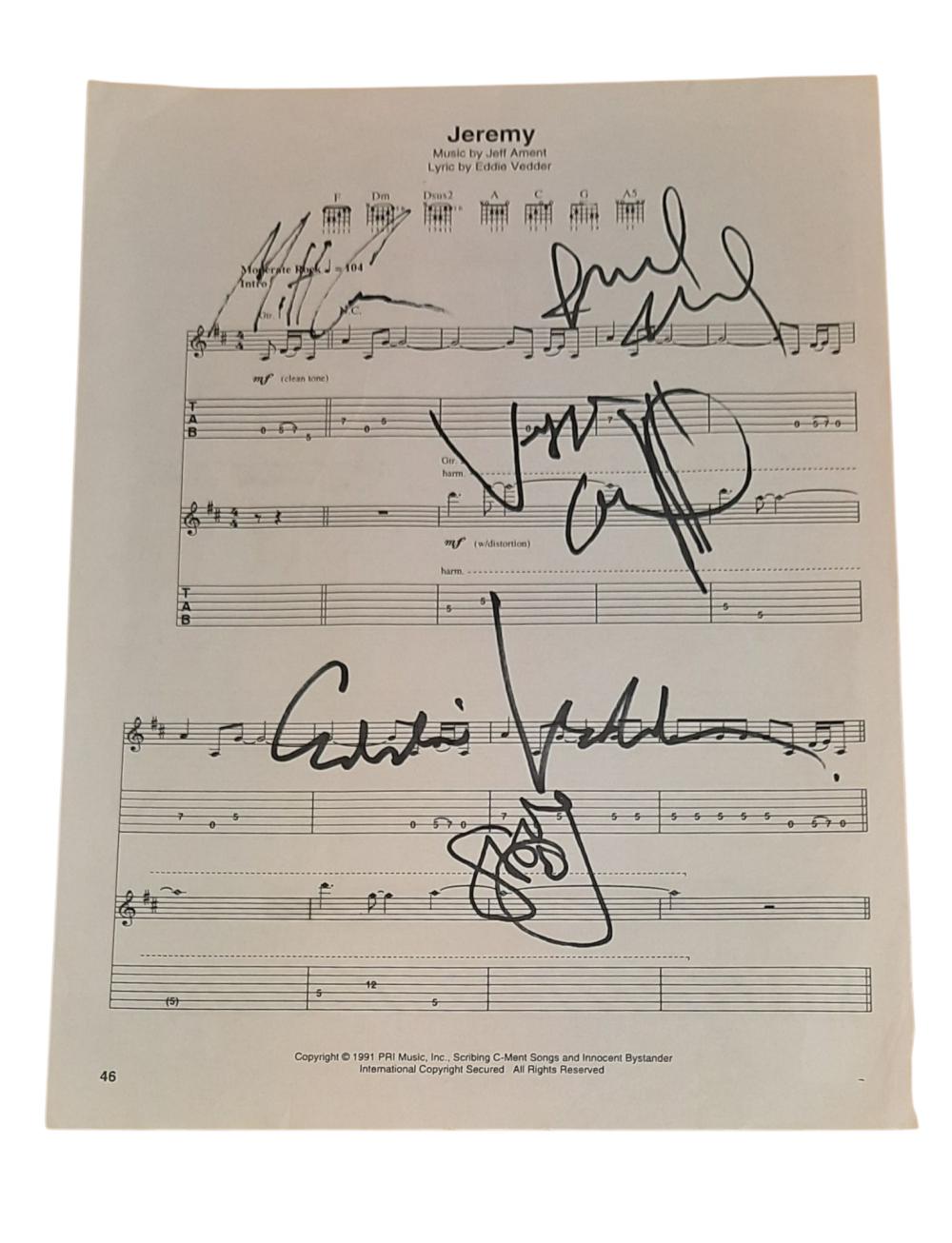 Sheet Music (Jeremy) autographed by Eddie Vedder, Matt Cameron, Mike McCready, Stone Gossard and Jeff ament of Pearl Jam. Great set of highly scoring Pearl Jam signings.