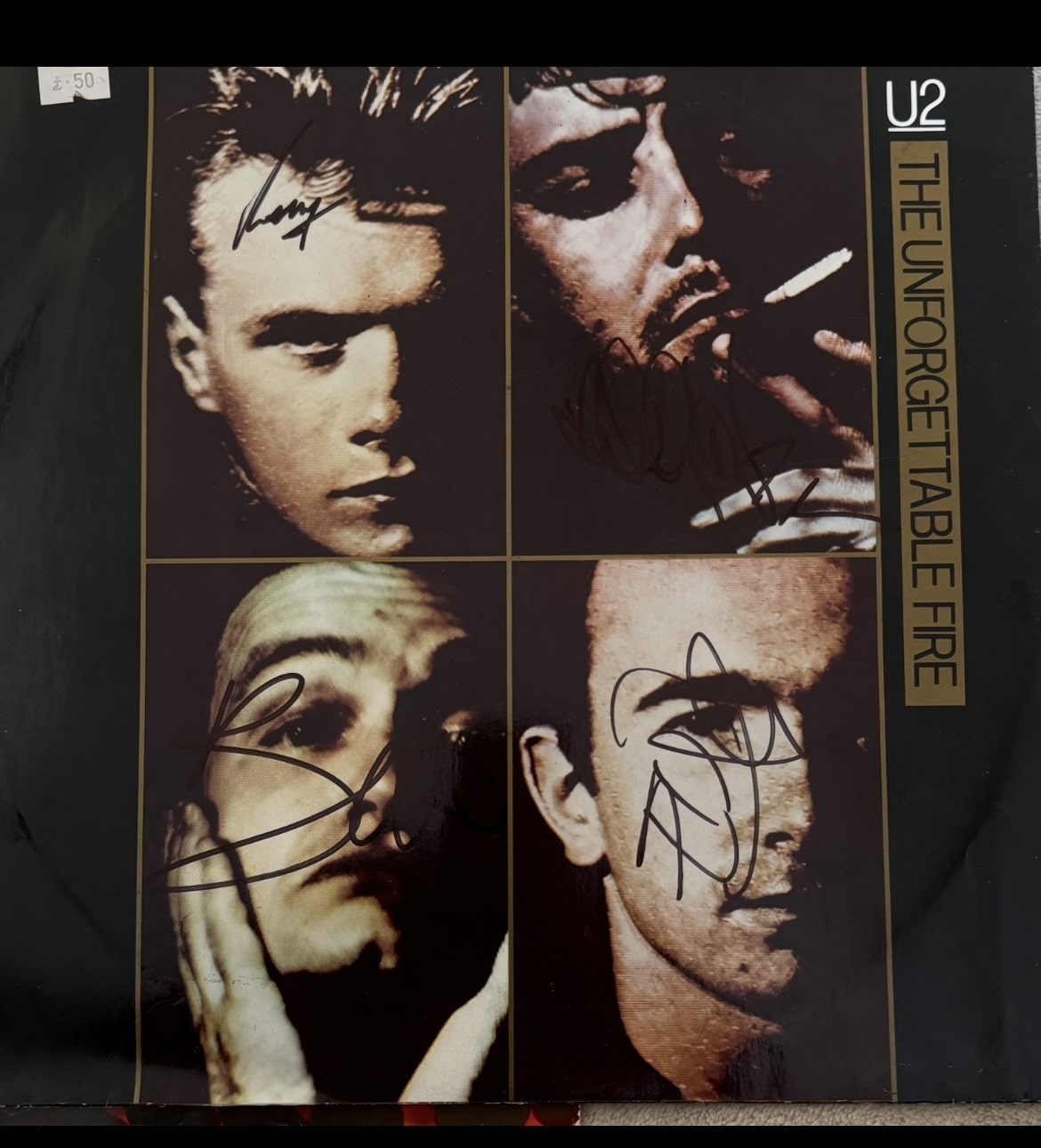 12″ Vinyl (The Unforgettable Fire) autographed by Bono, The Edge, Larry Mullen Jr and Adam Clayton of U2. Excellent set of U2 autographs.