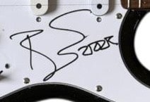 An electric guitar, autographed on the scratchplate in black sharpie pen by David Bowie. An excellent full example of a Bowie signing. Speed, pressure, shape and size of autograph are classic for the era of signing. Well matched with other known genuine examples.
