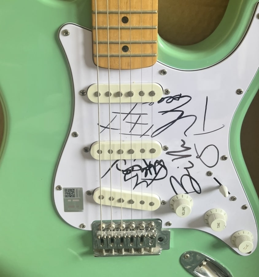 An electric guitar, autographed by Billie Joe Armstrong, Mike Dirnt and Tre Cool of Green Day. Signed on the scratchplate in black sharpie pen. Highly scoring example from the 2020’s.