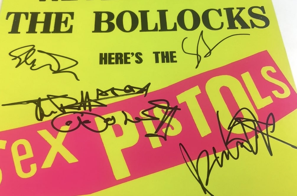 Vinyl LP (Never Mind The Bollocks) autographed by John Lydon, Paul Cook, Glen Matlock and Steve Jones of the Sex Pistols. Modern autographs signed in the UK throughout 2024. All are consistent with other recent examples.