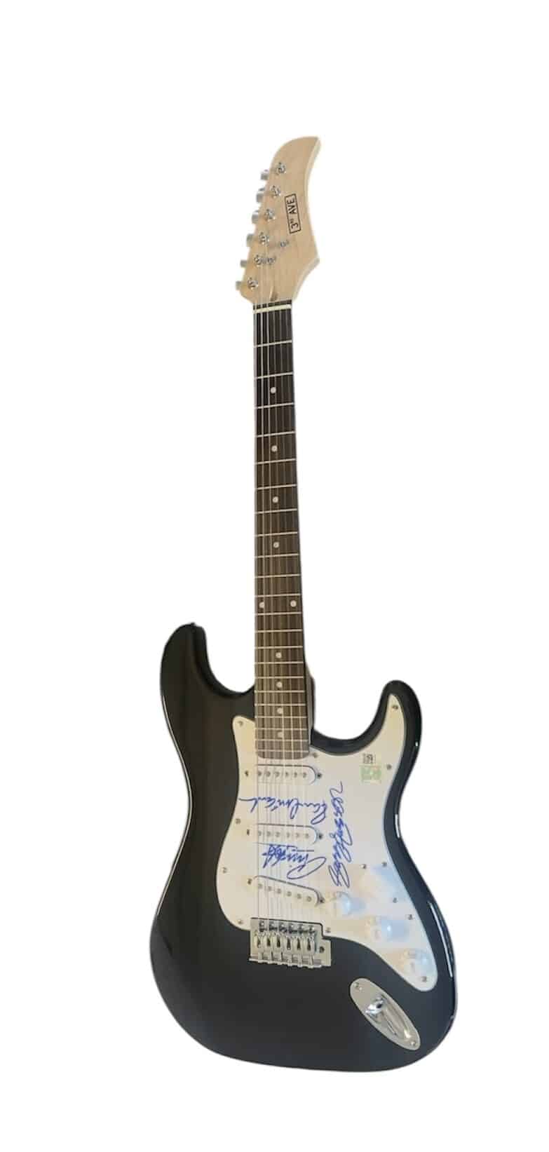 An electric guitar, autographed on the scratchplate by George Harrison, Paul McCartney and Ringo Starr of The Beatles. An exceptionally nice and rare set of three of The Beatles autographs. All signed in clear blue sharpie pen. The plate has some date to it. Judging by the style of the autographs, both of the McCartney and Starr appear to be from the late 1990’s possibly early 2000’s The Harrison autograph could be from slightly earlier looking at the style. Possibly a mid 1990’s signing but could also date as late 1990’s A lovely set of rare autographs.