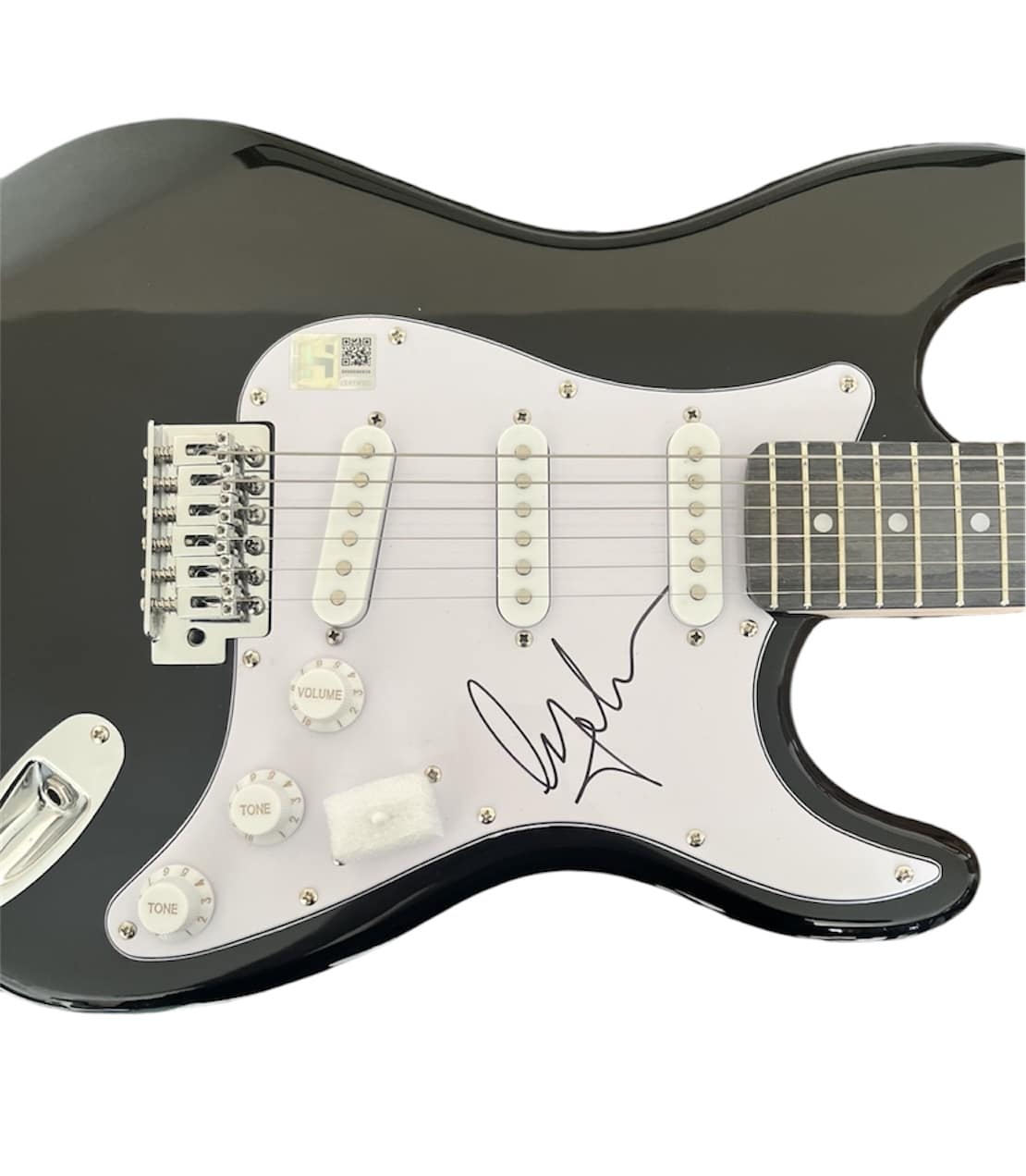 An electric guitar, autographed on the scratchplate in black sharpie pen by Madonna. Excellent full autograph, probably from mid 2000’s judging by the style.