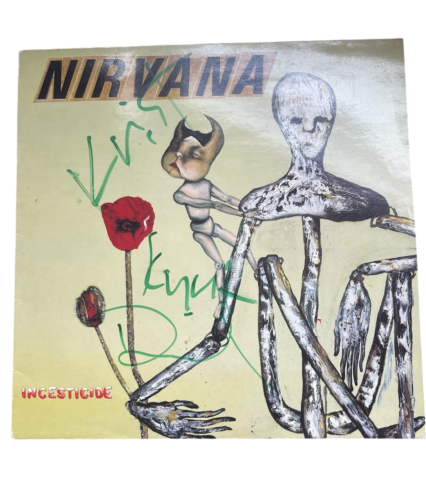 A Vinyl LP (Incesticide) autographed by Kurt Cobain, David Grohl and Krist Novoselic of Nirvana. A very rare example of a fully signed Nirvana LP. Signed by all three members in sharpie pen. Very good examples. Comes with letter of stating time and date of signing.