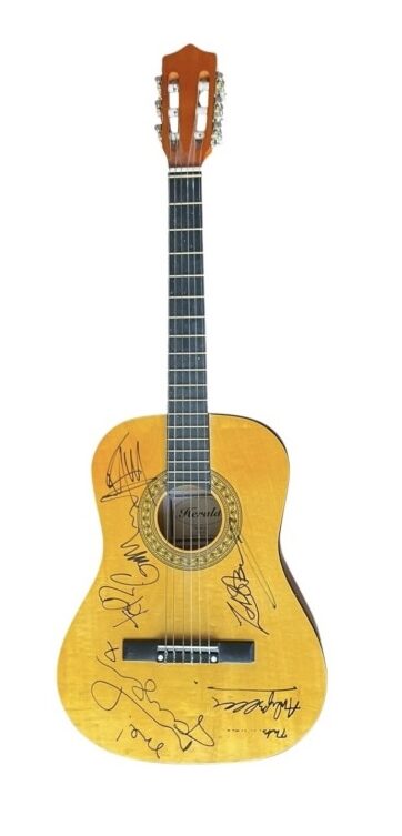 A acoustic guitar, autographed by Noel Gallagher, Liam Gallagher, Gem Archer, Andy Bell and Zak Starkey of Oasis. Great set of Oasis autographs from the mid 2000’s.