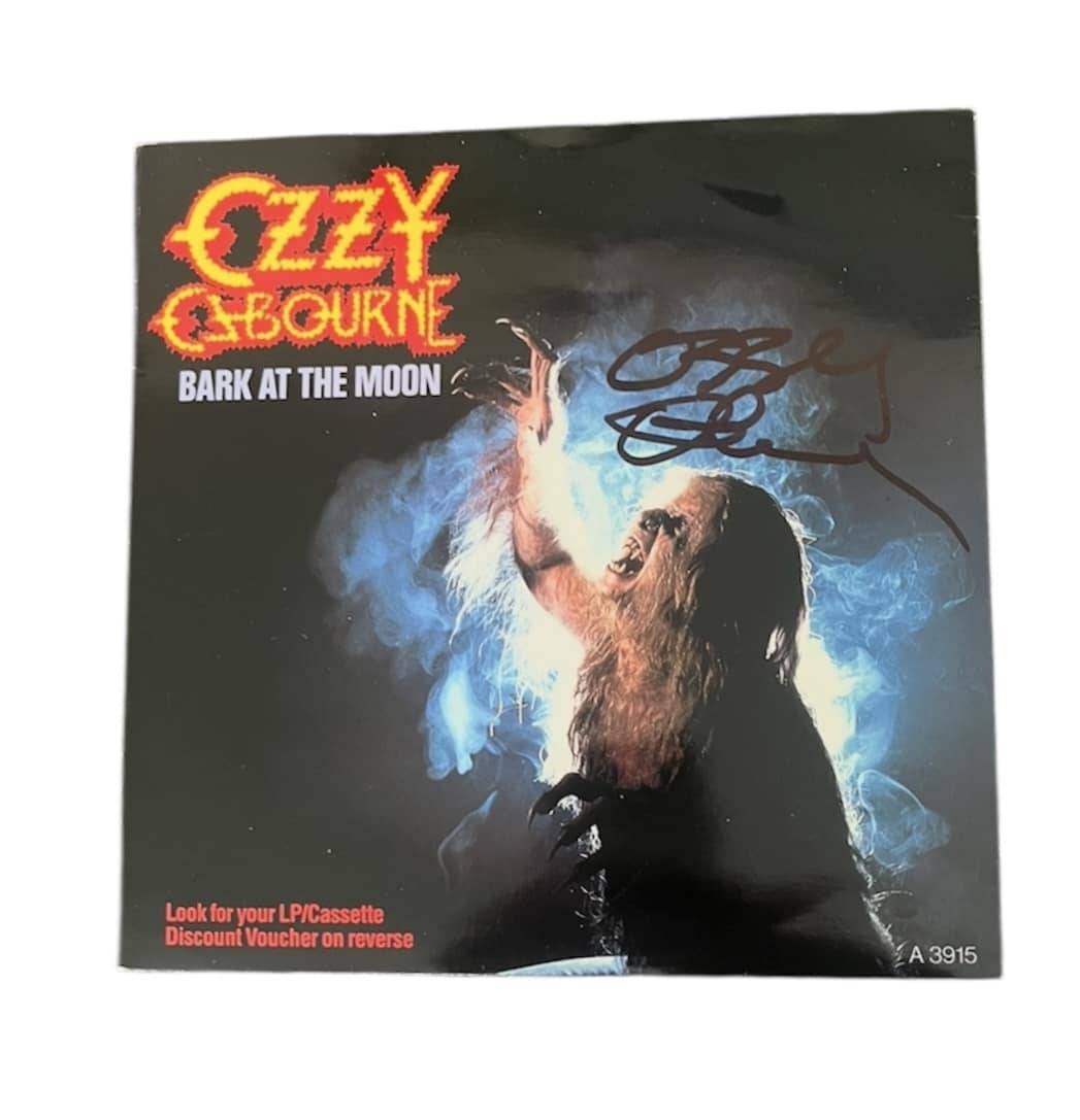 A vinyl 45 (Bark At The Moon) autographed by Ozzy Osbourne. A nice full name example of Ozzy’s autograph.