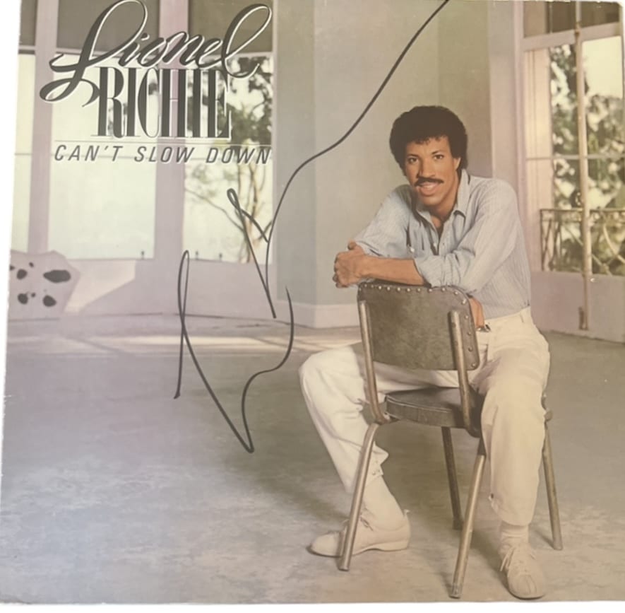 A vinyl LP (Can’t Slow Down) autographed on the front cover in black sharpie pen by Lionel Richie. Abbreviated initialled signing. Contemporary example.