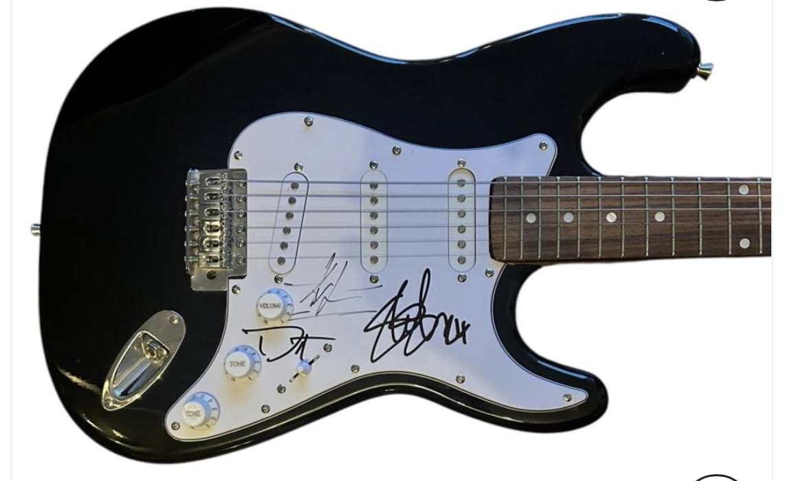 An electric guitar, autographed by Axl Rose, Slash and Duff McKagan of Guns n Roses. Modern autographs. Slash has dated the signing 2024. Axl signing is a little rushed as is Duff’s but still genuine.