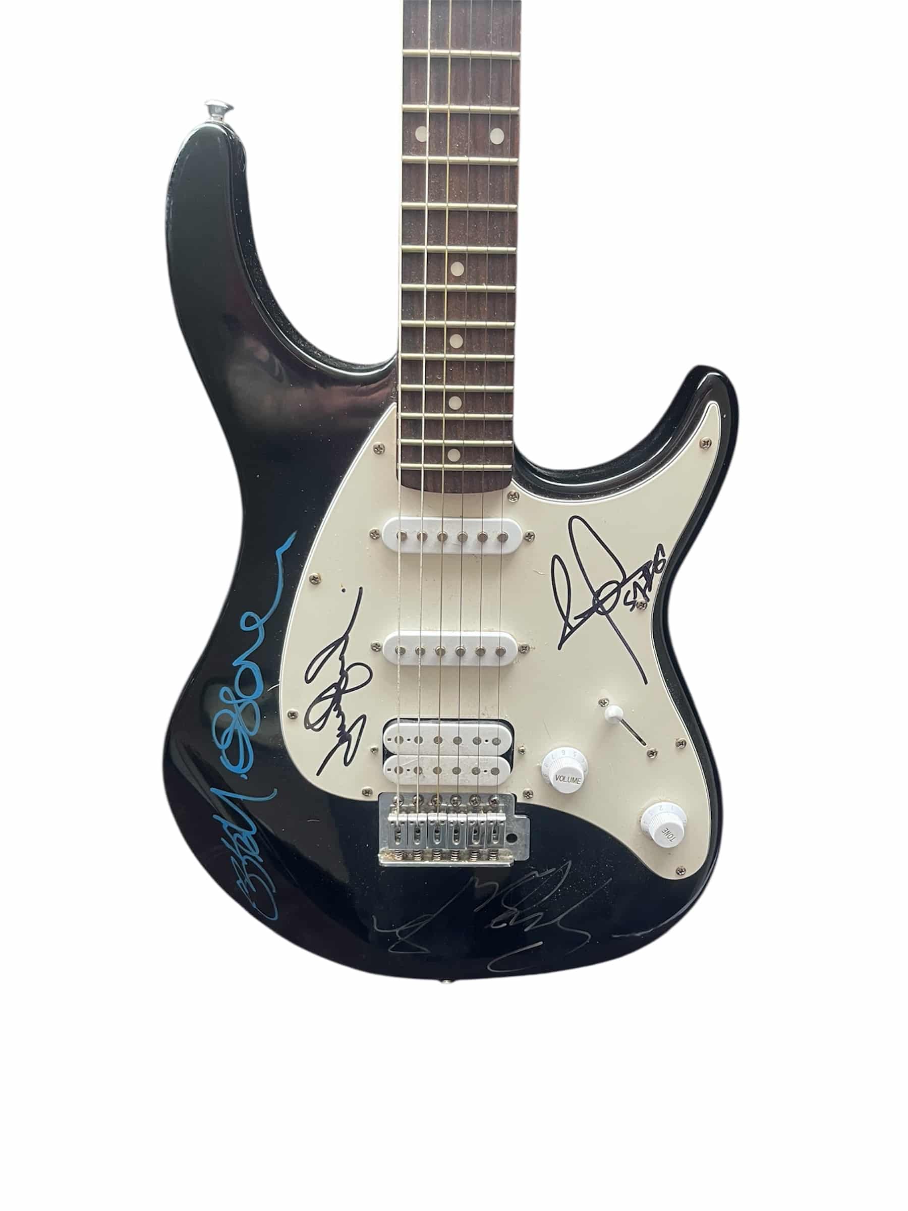 An electric guitar, autographed on the body and scratchplate by Ozzy Osbourne, Tony Iommi, Geezer Butler and Bill Ward of Black Sabbath. Great set of Sabbath signings. All full name examples. Bold, clear and with great flow.