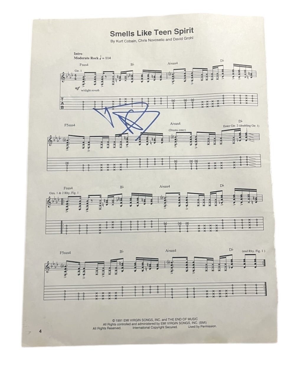 Sheet Music (Smells Like Teen Spirit) autographed by Dave Grohl of Nirvana. Good classic example of a Grohl autograph. Impressive and genuine.