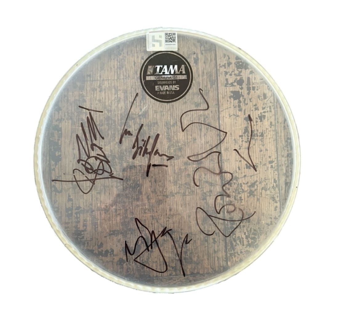 A drumskin, signed by Mick Jagger, Keith Richards, Ronnie Wood and Bill Wyman of The Rolling Stones. Great set of contemporary autographs. Street signings as Jagger and Richards are rushed examples. Wood and Wyman are more classic in style.