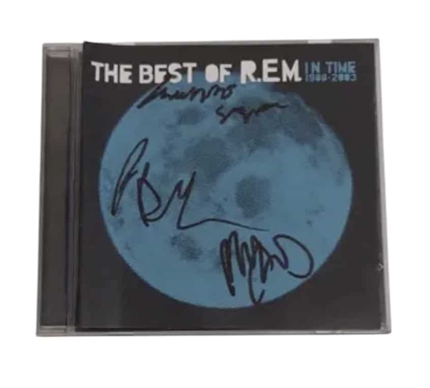A CD (The Best Of REM) autographed by Peter Buck, Mike Mills and Michael Stipe. Very rare to see all three autographs together on one piece. Very nice examples.