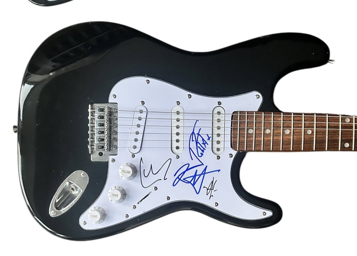 An electric guitar, autographed by James Hetfield, Kirk Hammett, Lars Ulrich and Robert Trujillo of Metallica. Good set of Metallica autographs judging by the style, all seem to be from the late 1990’s.