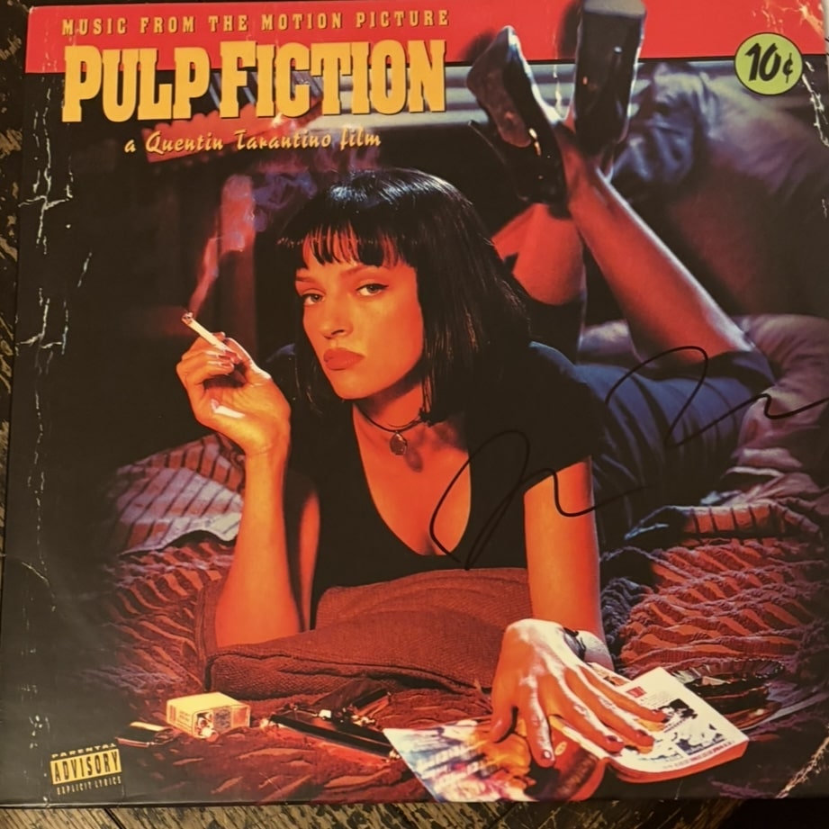 A vinyl LP (Soundtrack to Pulp Fiction) autographed by Quentin Tarantino. Typical 2020’s Tarantino autograph. Consistent with other modern examples.