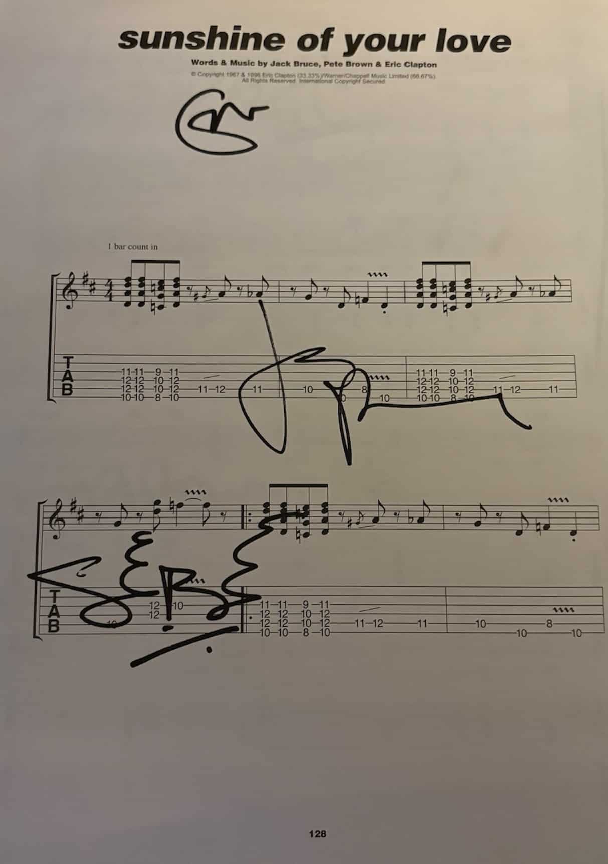 Sheet music (Sunshine Of Your Love) autographed by Eric Clapton, Jack Bruce and Ginger Baker of Cream. Good full set of Cream autographs. Signed in early 2000’s.