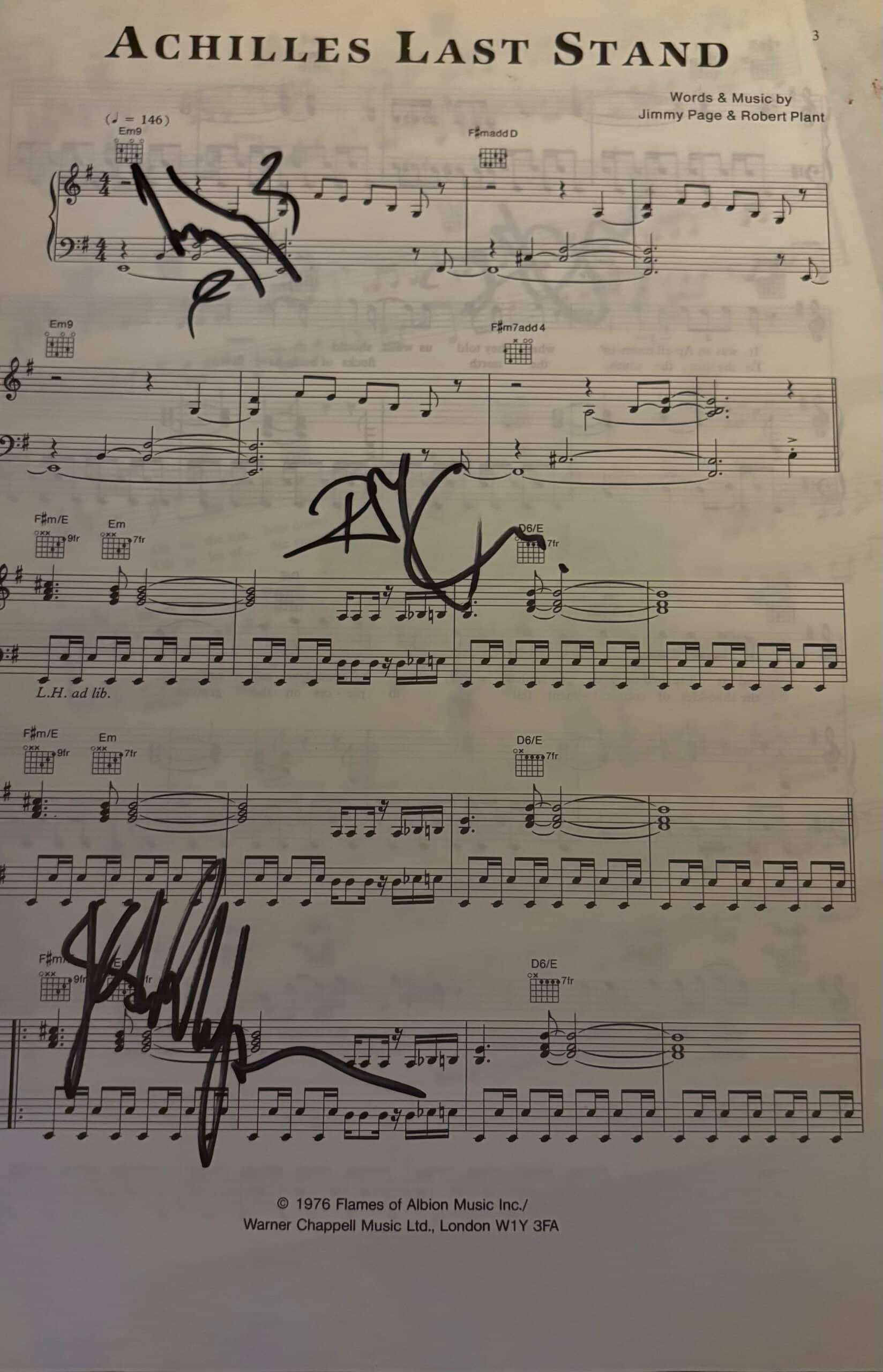 Sheet music (Achilles Last Stand) autographed by Robert Plant, Jimmy Page and John Paul Jones of Led Zeppelin. Good clean set of Zeppelin signings.