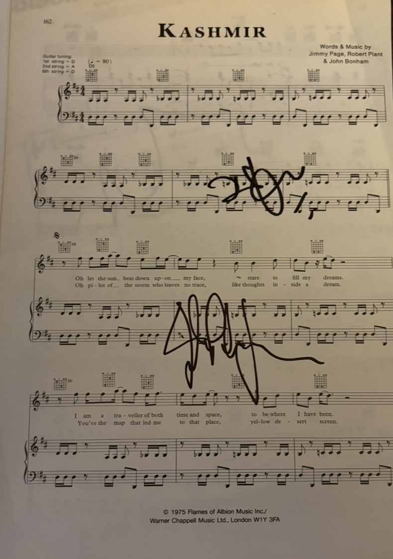 Sheet Music (Kashmir), autographed by Robert Plant and John Paul Jones of Led Zeppelin. Autographs as expected for genuine examples.