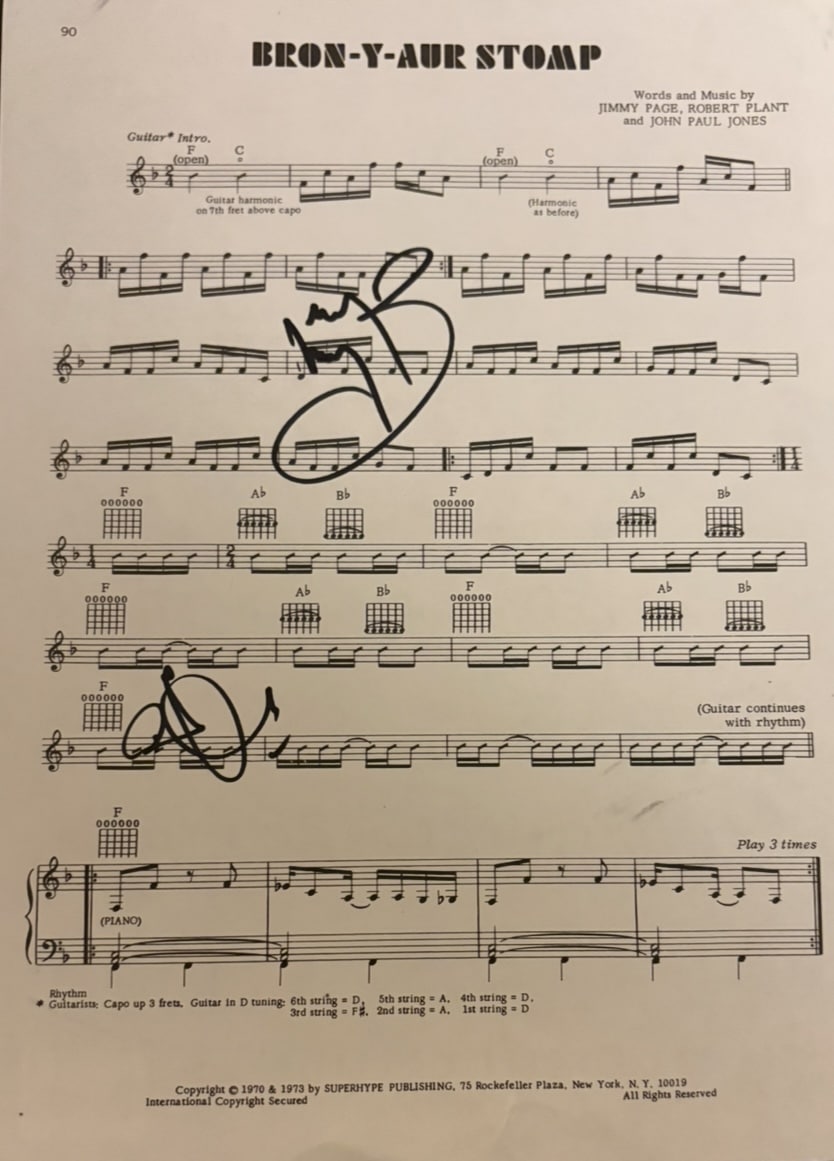 Sheet Music (Bron – Y – Aur – Stomp), autographed by Robert Plant and Jimmy Page. Excellent duo of autographs from the early 2000’s.