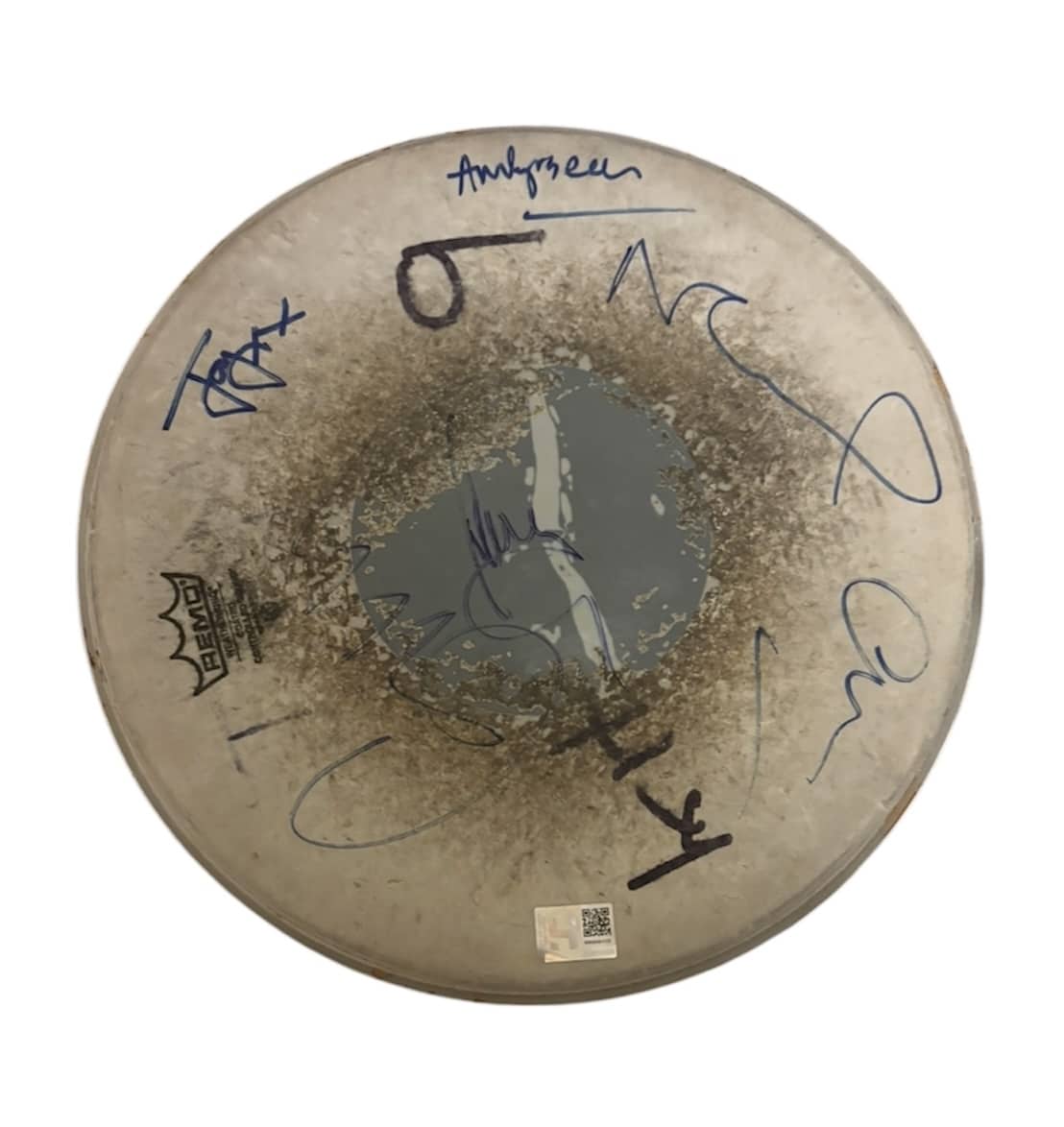 A drumskin, autographed by Noel Gallagher, Liam Gallagher, Andy Bell, Gem Archer, Jay Darlington and Alan White of Oasis. A lovely classic set of Oasis autographs, signed on the front of the skin. Good clear set of vintage Oasis autographs.