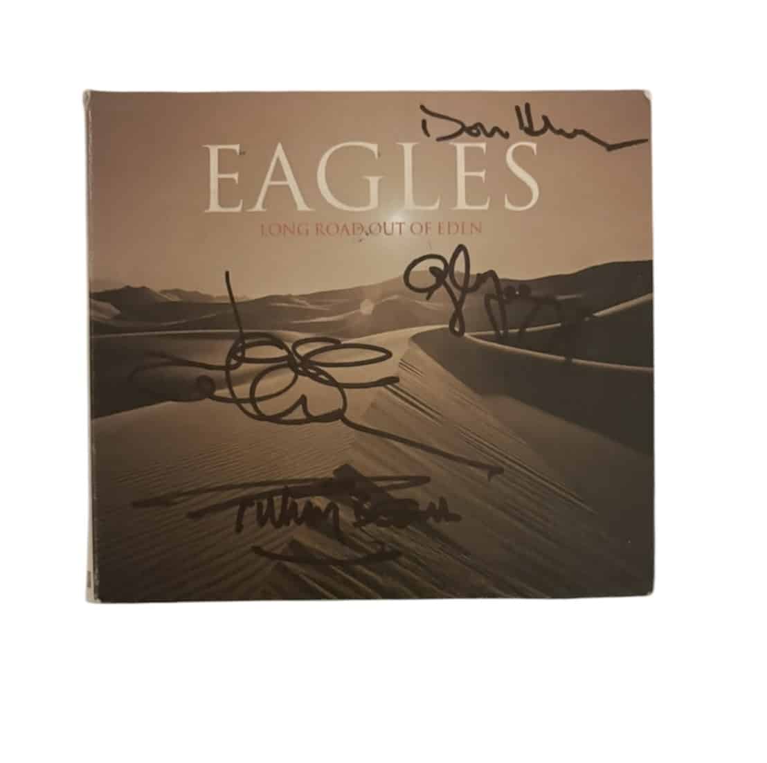 A CD (Long Road Out Of Eden), autographed by Don Henley, Glenn Frey, Timothy B. Schmit and Joe Walsh of the Eagles. Great set of Eagles autographs. Style suggests they are all from the early 2000’s.
