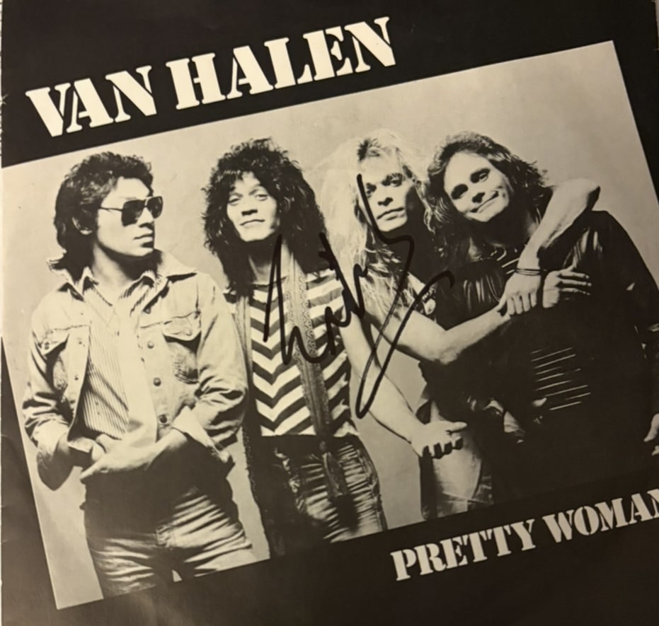 A vinyl 45 (Pretty Woman), autographed on the front of the vinyl sleeve by Eddie Van Halen of Van Halen.