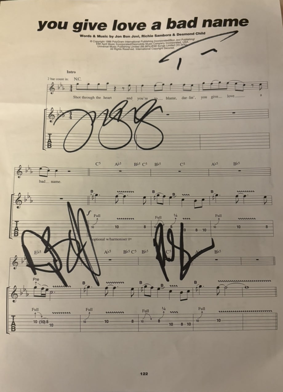 A page of sheet music (You Give Love A Bad Name), autographed by Jon Bon Jovi, Richie Sambora, Tico Torres and David Bryan of Bon Jovi. Great full set of Bon Jovi autographs.